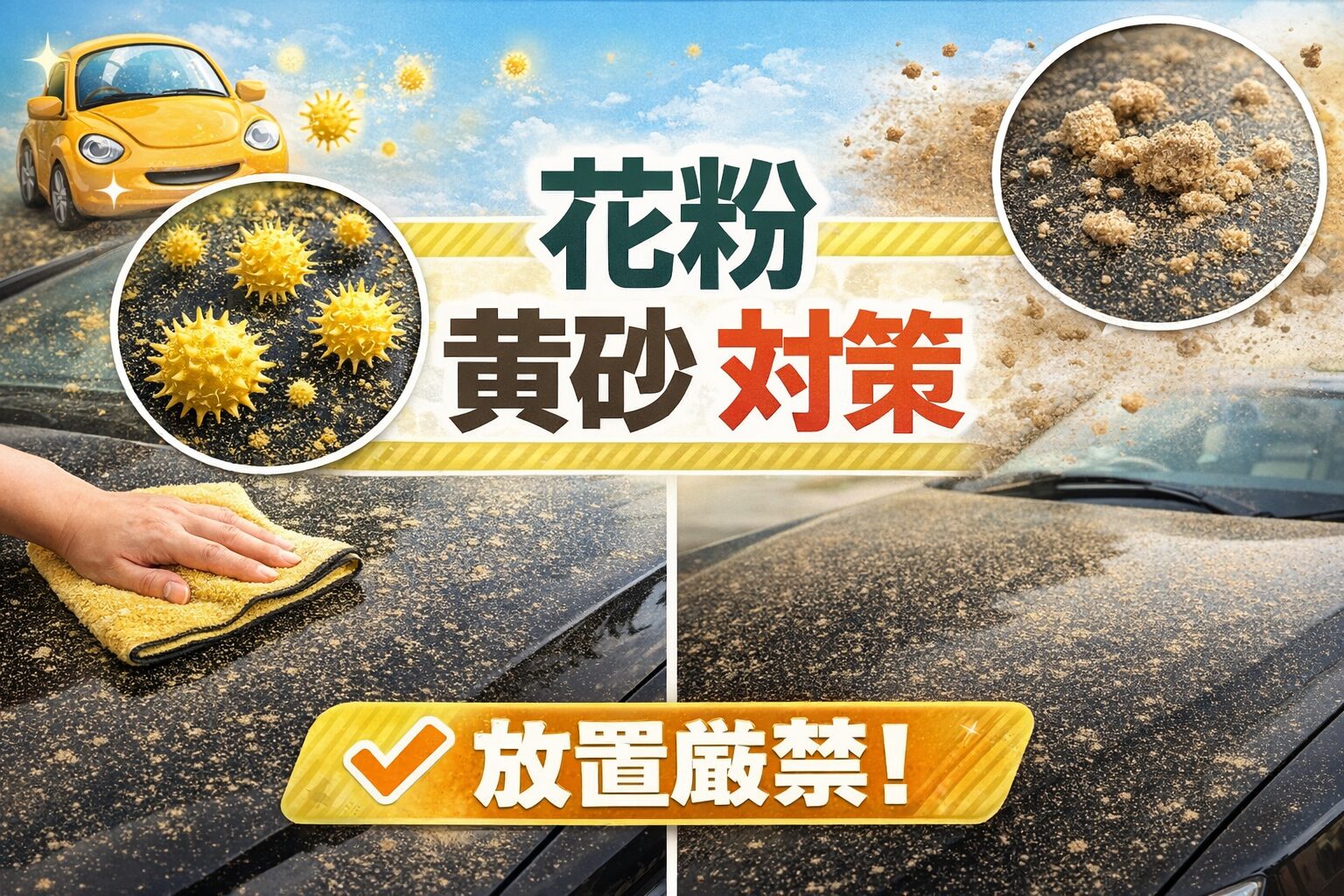 春になると、車のボンネットや屋根に黄色い粉のような汚れが付くことがあります。