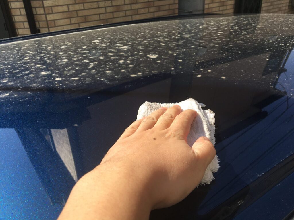 洗車機から出てきたら、そのまま公道に出ちゃダメ。ボディに残った水滴が乾くと、ガチガチの「水垢」になって取れなくなるから。